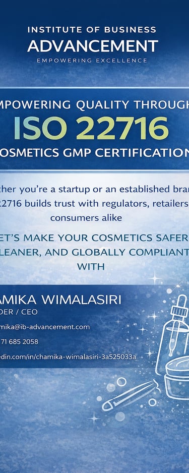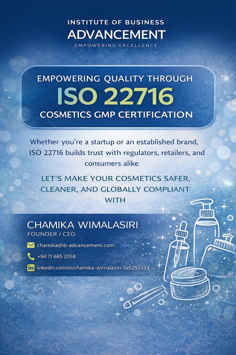 At the Institute of Business Advancement (IBA), we help cosmetic manufacturers, private label brands, and beauty startups achieve international credibility through expert ISO 22716 – Cosmetics Good Manufacturing Practices (GMP) consultancy and professional training services.