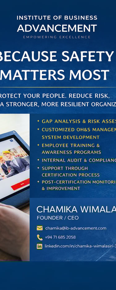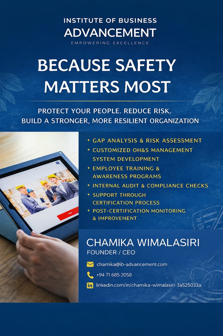 At the Institute of Business Advancement (IBA), we help organisations create safer workplaces, reduce operational risks, and build resilient safety cultures through expert Occupational Health & Safety Management System (OHSMS) consultancy and professional training services aligned with ISO 45001 and international best practices.