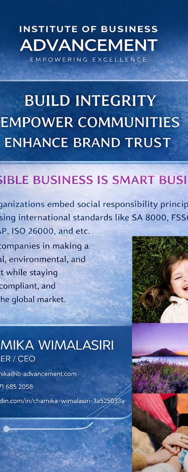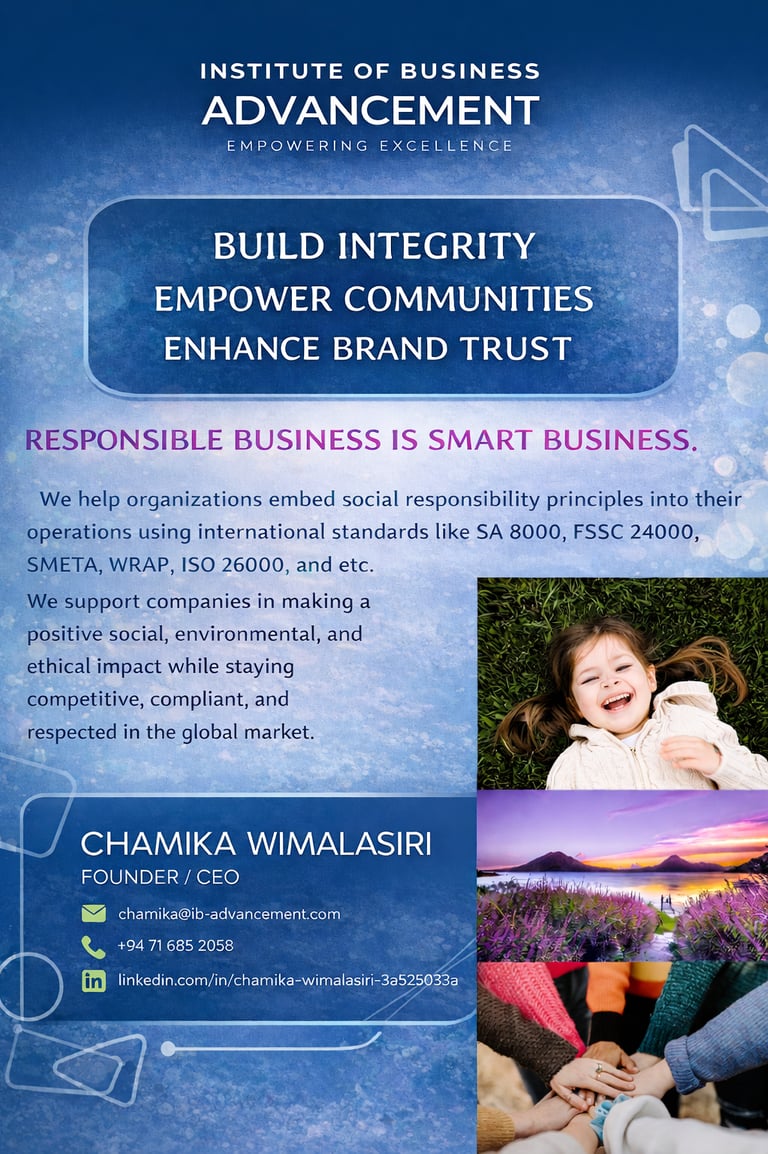 At the Institute of Business Advancement (IBA), we help organisations turn responsible business principles into measurable competitive advantage. Our integrated Responsible Business Services (RBS) consultancy and training solutions enable companies to embed ethical governance, social accountability, and sustainability into everyday operations — not just policies.